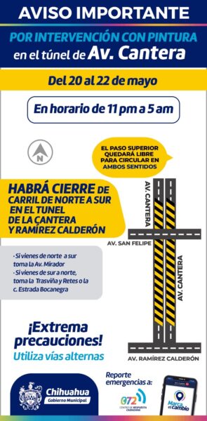 Por otra parte, recordó la intervención de pintura en el túnel ubicado en la avenida La Cantera, a la altura de la calle Ramírez Calderón, donde se tendrá el cierre total del carril de norte a sur, por lo que será indispensable desviar el tránsito vehicular por la parte lateral del túnel; estas labores se realizarán del 20 al 22 de mayo en horario nocturno de 11:00 pm a 5:00 am.
