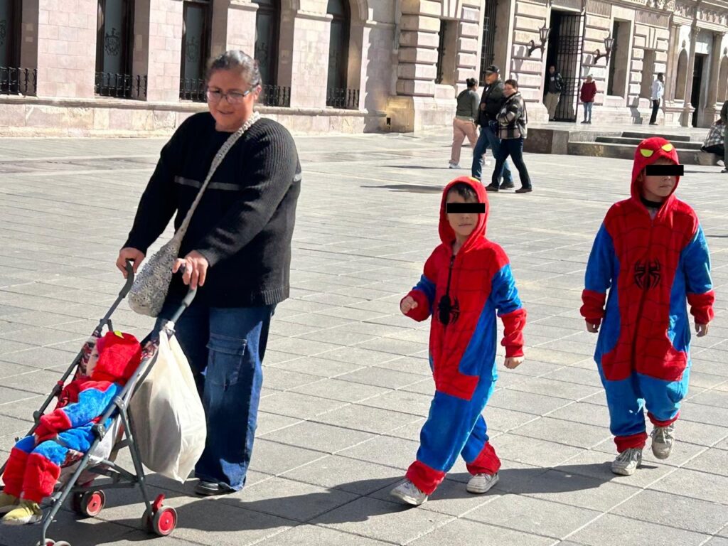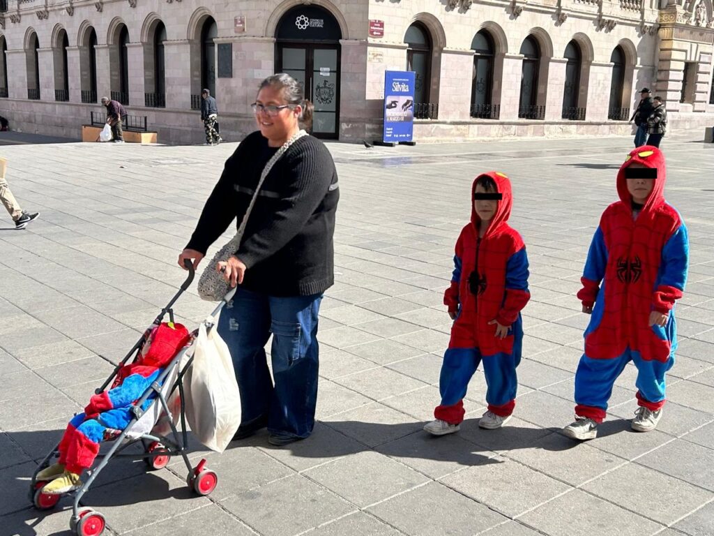 Una escena colorida y tierna llamó la atención de los transeúntes en la Plaza de Armas de Chihuahua durante la mañana de este martes. Una madre de familia paseaba acompañada de sus tres pequeños hijos, todos vestidos con pijamas del Hombre Araña, mientras realizaban sus actividades cotidianas bajo el sol invernal. Los dos niños mayores caminaban a su lado, y el más pequeño iba cómodamente en su carriola, todos abrigados y contentos, disfrutando del solecito que contrastaba con el frío intenso que ha mantenido a muchos niños en casa estos días.