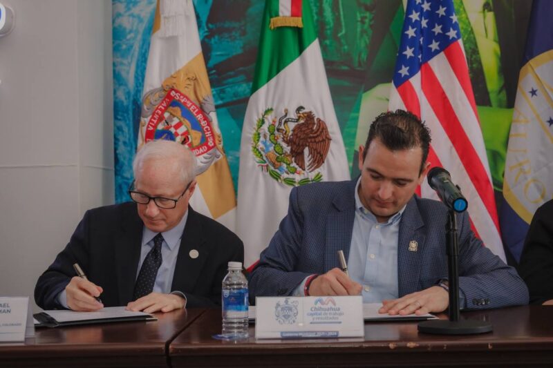 _*Chihuahua, Chih. A 07 de diciembre de 2023*_ El alcalde de Chihuahua, Marco Bonilla, encabezó la firma de hermanamiento entre Chihuahua Capital con la ciudad de Aurora en Colorado, Estado Unidos de América; con el propósito del intercambio de buenas prácticas, compartir políticas públicas y estrechar lazos para impulsar el desarrollo de ambos lugares.
