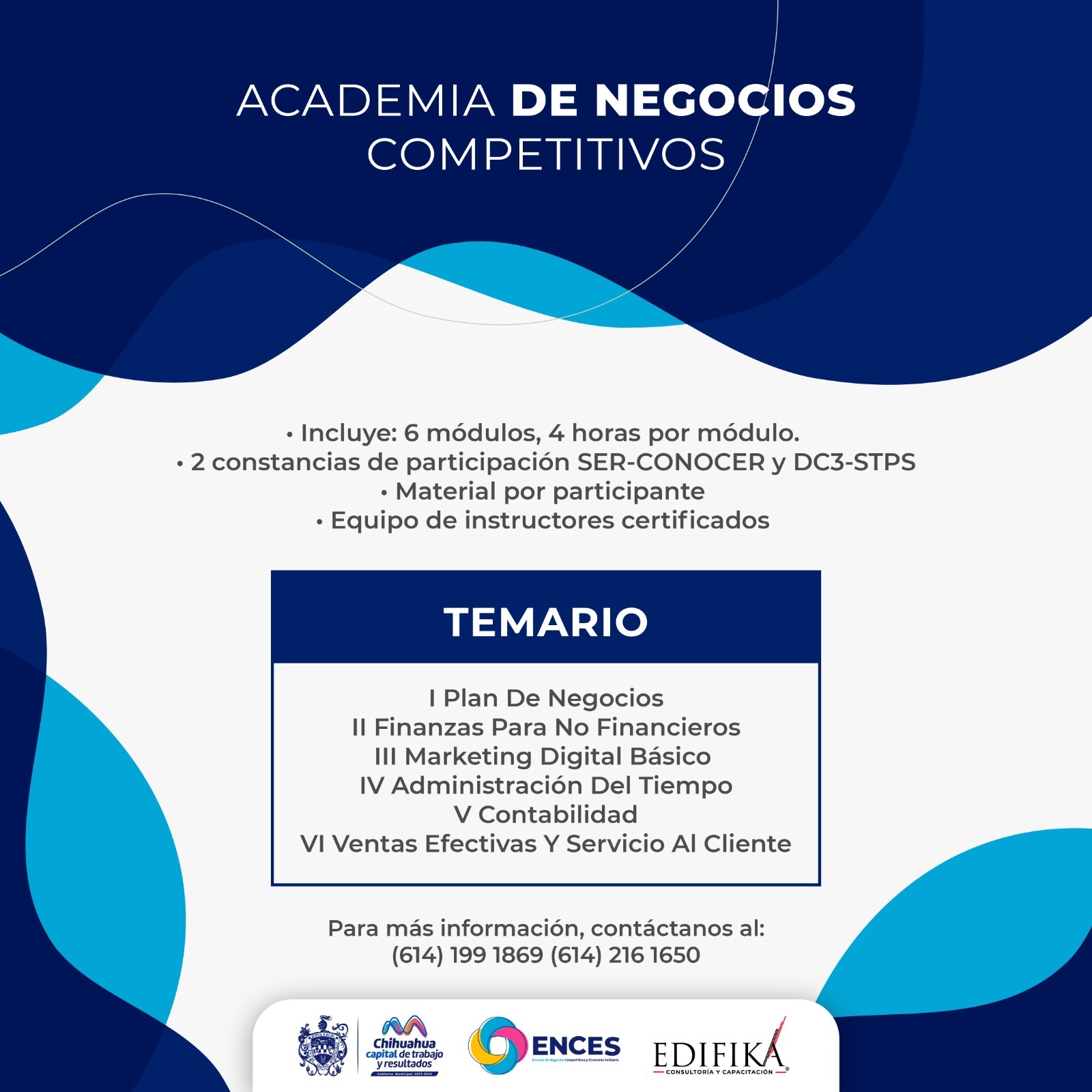 Finalmente, el Gobierno Municipal invita a las y los interesados en formar parte de esta Academia de Negocios Competitivos, a comunicarse al (614) 199-18-69 o al (614) 216-16-50. Así mismo, pone a su disposición el siguiente link de registro: bit.ly/3So3TjK.