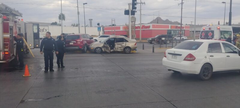 Un choque aparatoso se registró entre un Ford Focus color dorado, que circulaba de sur a norte por la avenida Independencia, y una camioneta Ford Escape color guinda, que iba de oeste a este por la calle Fuentes Mares. Ambos conductores alegan tener luz verde.