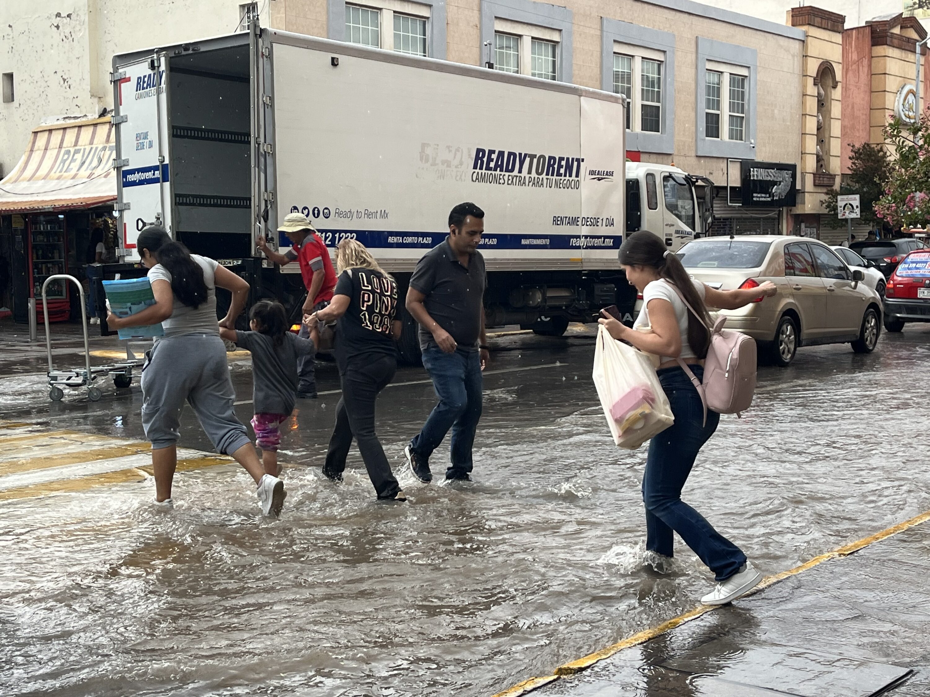Una fuerte precipitación que cayó en el Centro de la ciudad provocó inundaciones en calles principales, como en la Vicente Guerrero, Victoria, Aldama y Juárez.