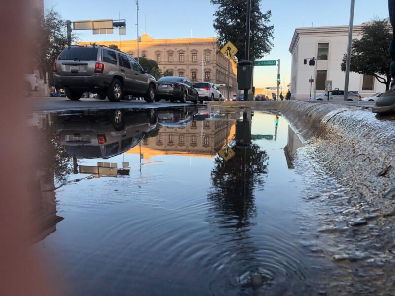 Fuga de agua en la calle 11 y Escorza en el centro de Chihuahua