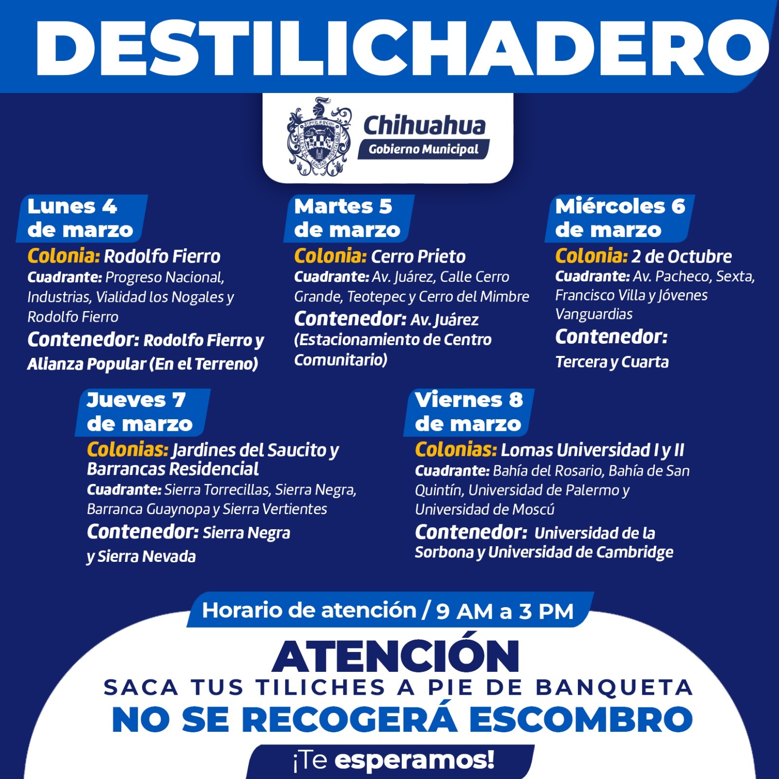 Chihuahua, Chih. A 2 de marzo de 2024.- Para evitar acumulaciones de basura de grandes dimensiones en las viviendas lo que podría generar plagas o problemáticas en la salud, el Gobierno Municipal, a través de la Dirección de Servicios Públicos Municipales, informa el calendario del programa Destilichadero, que se realizará del 4 al 8 de marzo en siete colonias de la Capital.
