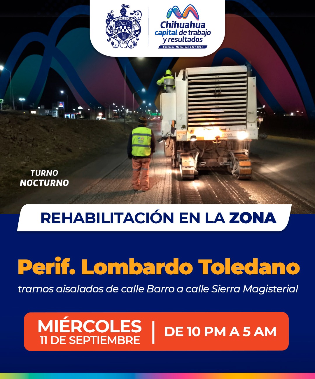 Chihuahua, Chih. A 11 de septiembre de 2024.- El Gobierno Municipal que preside el alcalde Marco Bonilla recuerda a los ciudadanos que a partir de hoy miércoles por la noche, comienzan los trabajos de fresado para la rehabilitación de la carpeta asfáltica en tramos aislados de periférico Lombardo Toledano, desde la calle Barro a Sierra Magisterial en sentido sur a norte.