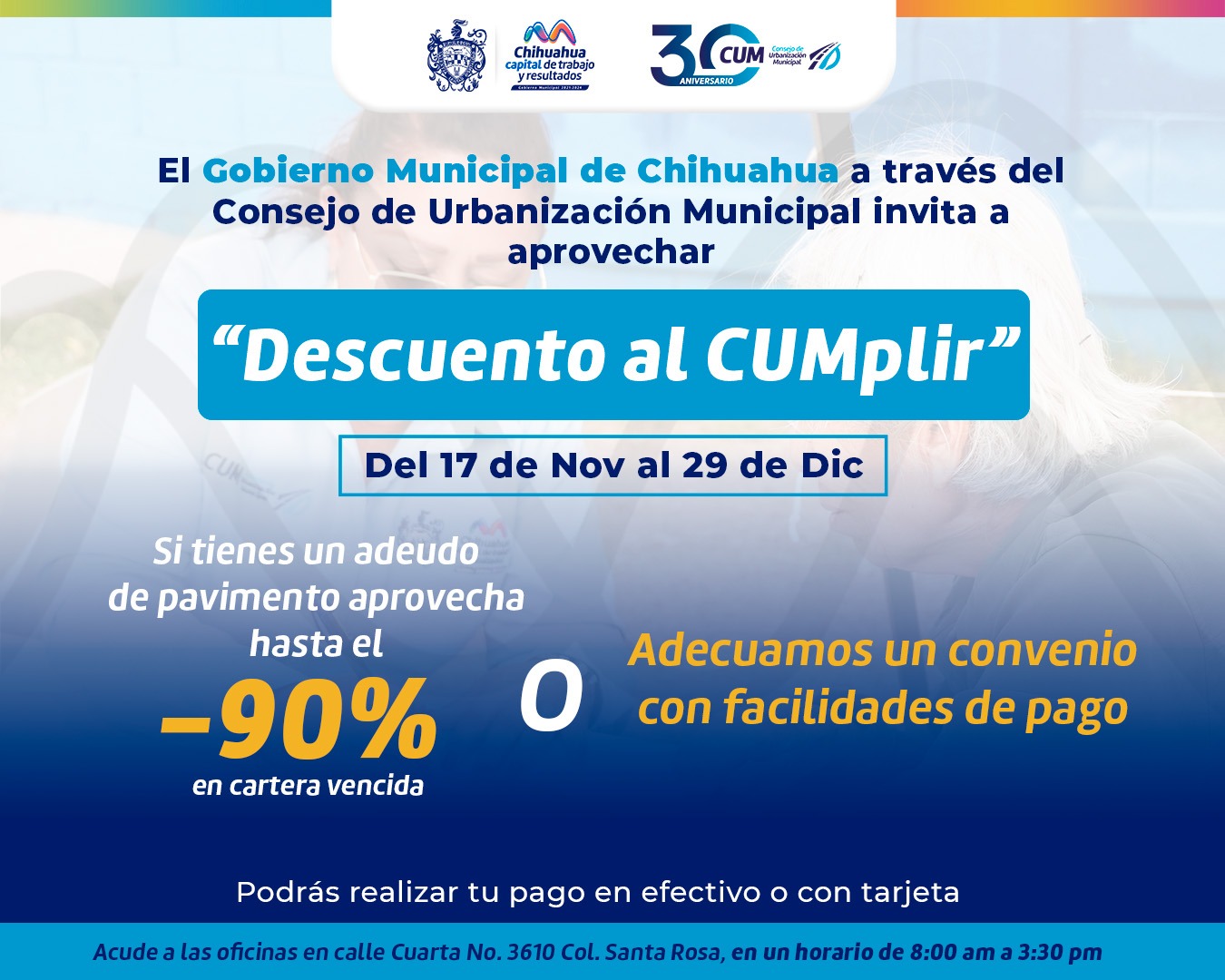 Como parte de los compromisos del alcalde Marco Bonilla de cuidar la economía de las familias chihuahuenses, el Gobierno Municipal a través del Consejo de Urbanización Municipal (CUM) invita a la ciudadanía a aprovechar el programa “Descuento al CUMplir” que dará inicio el próximo viernes 17 de noviembre.