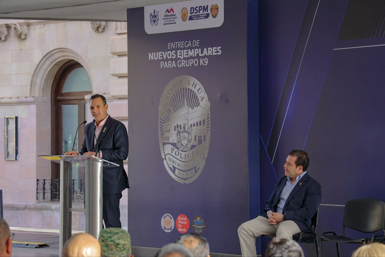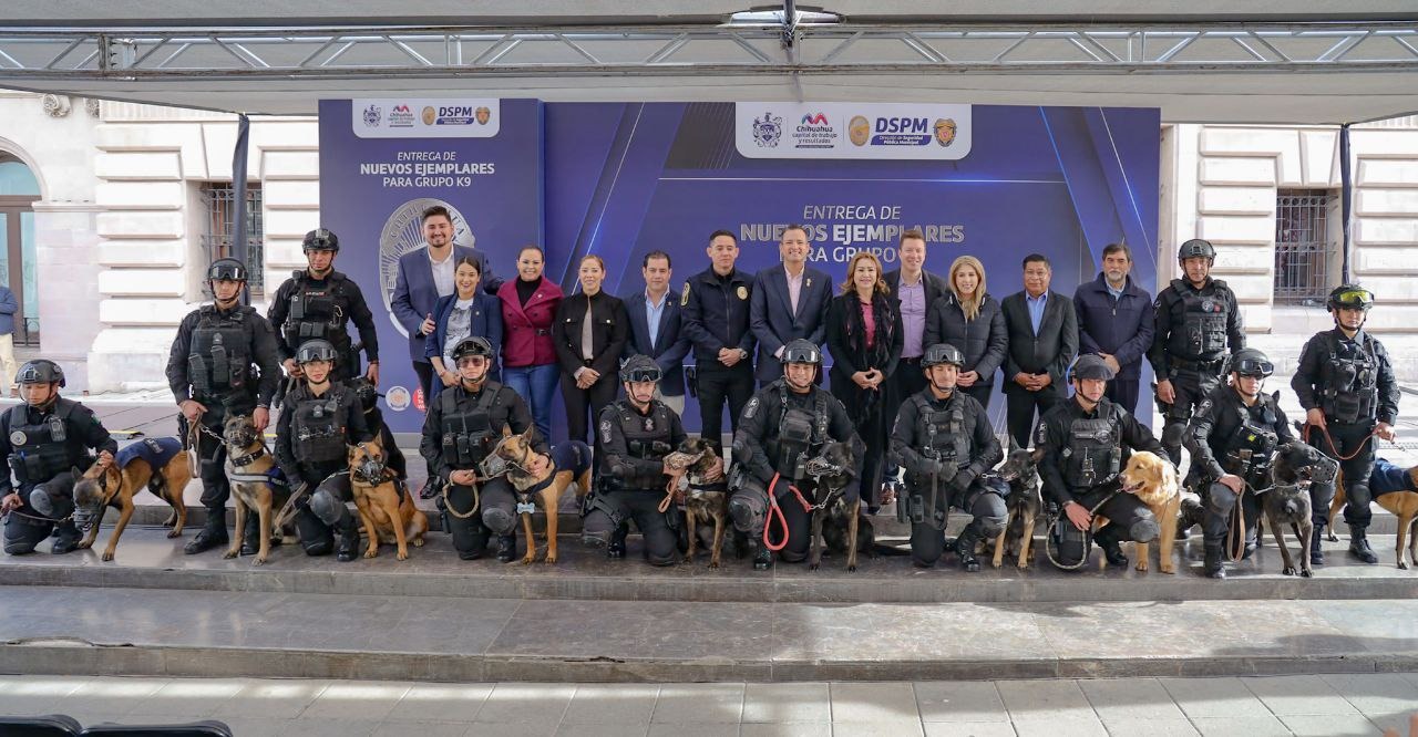 Chihuahua, Chih. A 22 de enero de 2024.- El alcalde Marco Bonilla Mendoza y el jefe de la Policía Municipal Julio César Salas, hicieron entrega de siete nuevos elementos caninos al Grupo K-9, que formarán parte de la corporación y apoyarán a sus compañeros en operativos para detectar narcóticos, armas, búsqueda, rescate y protección.