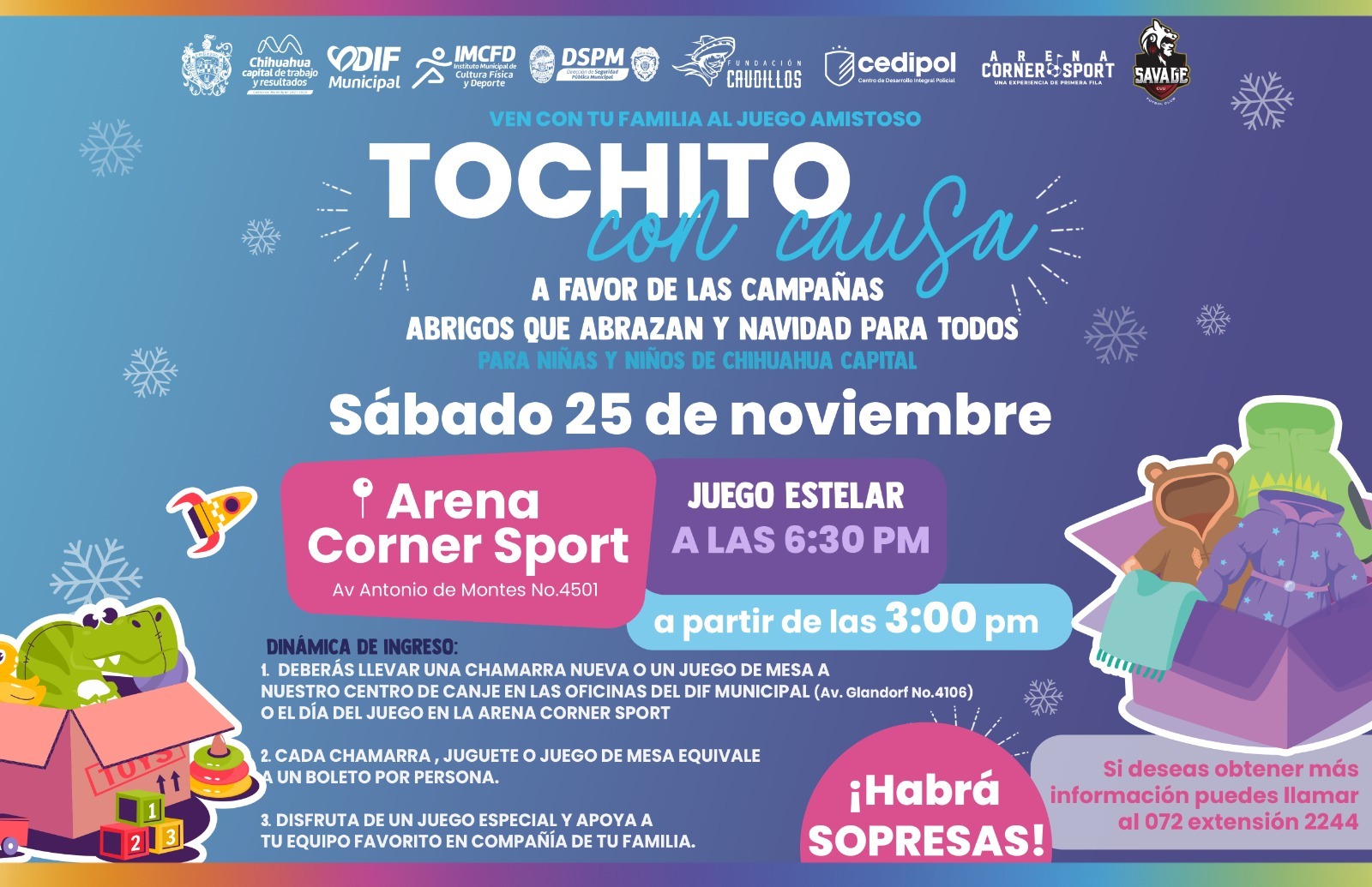 Uno de los objetivos del alcalde Marco Bonilla y la presidenta del DIF Municipal, Karina Olivas, es dignificar a niñas, niños y adolescentes (NNA) por ello el Gobierno Municipal a través del DIF y la Fundación Caudillos, invita al encuentro “Tochito con causa”, este sábado 25 de noviembre, donde el pase de entrada será una chamarra o un juguete para la campaña “Abrigos que Abrazan” y “Navidad para Todos”.