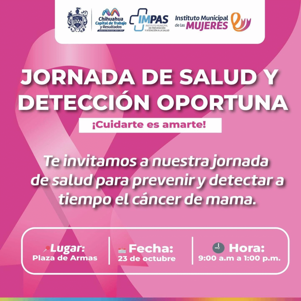 La regidora Lupita Borruel, presidenta de la Comisión de Salud del Ayuntamiento de Chihuahua, invita a todas las mujeres del municipio a acudir a la Jornada de Salud y Detección Temprana del Cáncer de Mama, que se llevará a cabo este jueves 23 de octubre, de 9:00 de la mañana a 1:00 de la tarde, en la Plaza de Armas.