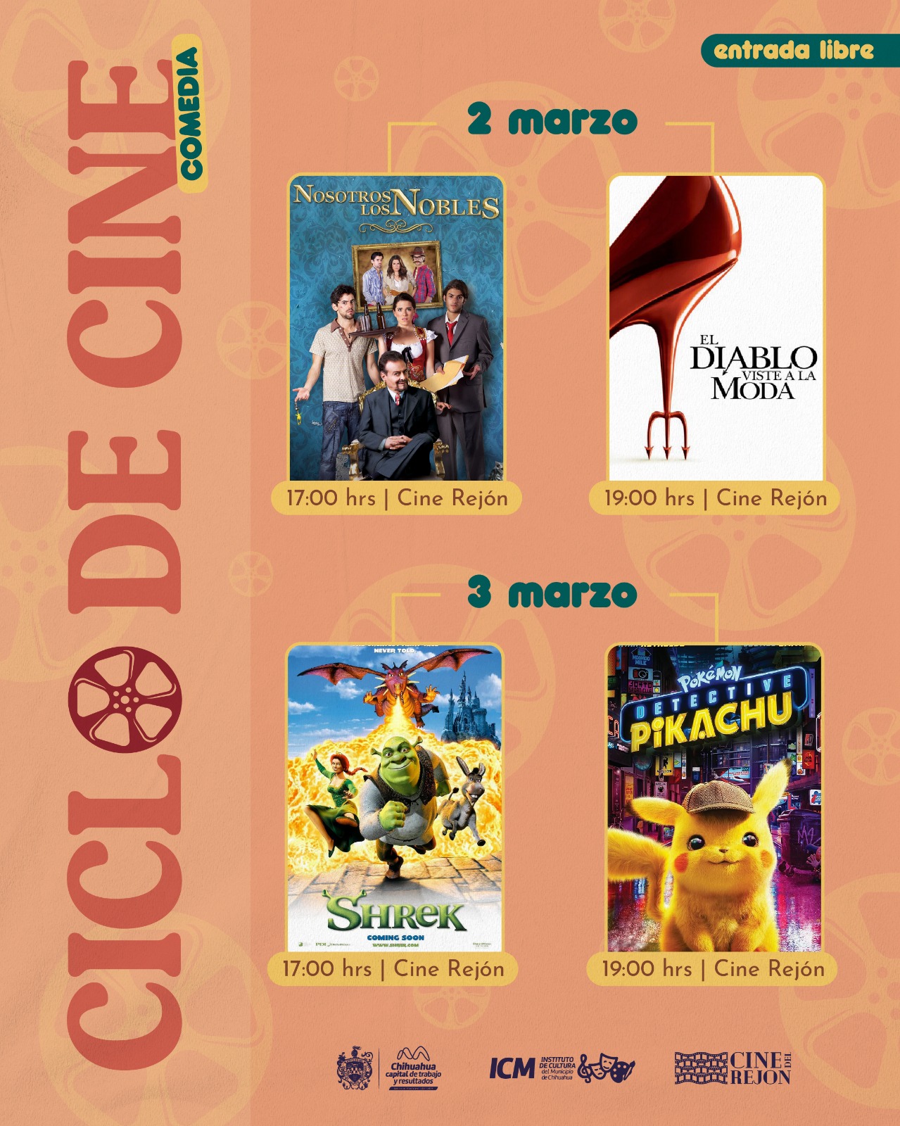 Chihuahua, Chih. A 27 de febrero de 2024.- El Gobierno Municipal, a través del Instituto de Cultura del Municipio (ICM), invita al Ciclo de Cine Comedia, un emocionante evento que llevará a cabo este 2 y 3 de marzo en el Cine del Rejón, donde se proyectarán películas que te harán llorar de risa.