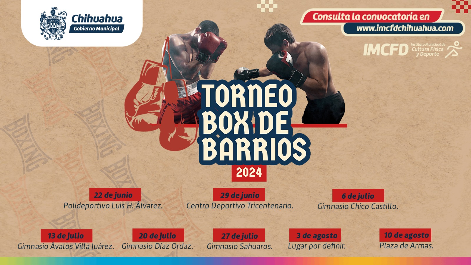 Chihuahua, Chih. A 16 de mayo de 2024.- El titular del Instituto Municipal de Cultura Física y Deporte, Juan Abdo Fierro, dio a conocer la convocatoria para participar en el Torneo de Box de Barrios edición 2024, la cual estará disponible hasta el 10 de junio.