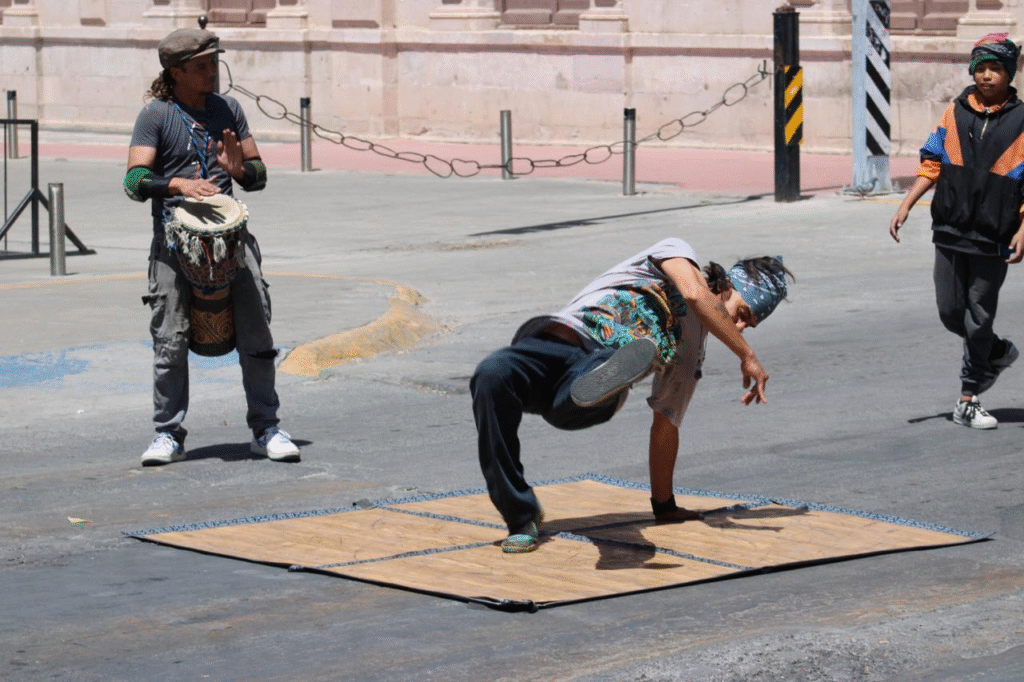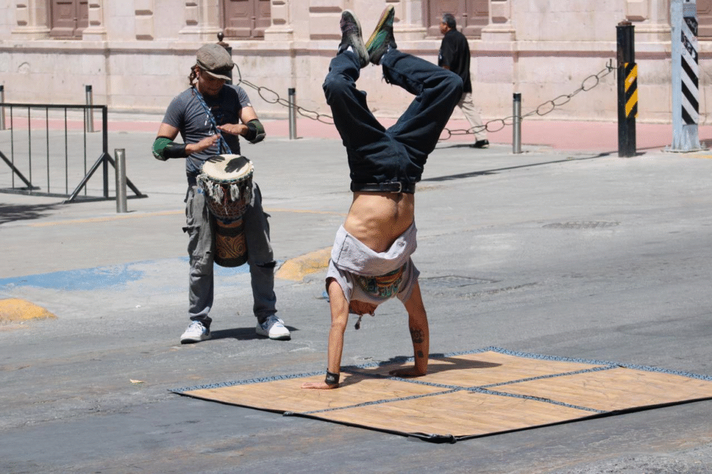 En plena zona centro de la ciudad de Chihuahua, justo en el cruce frente al Palacio de Gobierno, un grupo de jóvenes ha convertido los semáforos en escenario para mostrar talento, promover la cultura urbana y recaudar fondos para sus actividades deportivas.