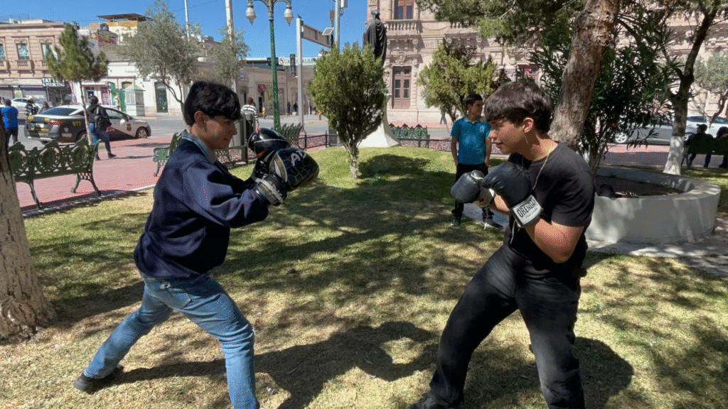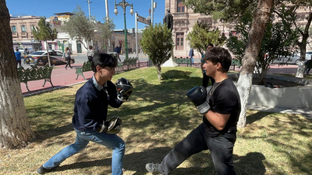 El Colegio Nuevo Siglo, ubicado en la calle Vicente Guerrero #804 cerca de la plaza —“el edificio azul”, como lo describieron—, parece ser un semillero de jóvenes interesados en el boxeo, quienes encuentran en los espacios públicos del centro histórico un lugar para entrenar y prepararse. “Practicamos el boxeo”, afirmaron con sencillez, mientras continuaban sus ejercicios de calentamiento.