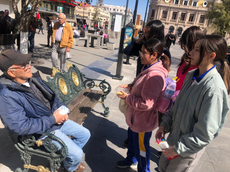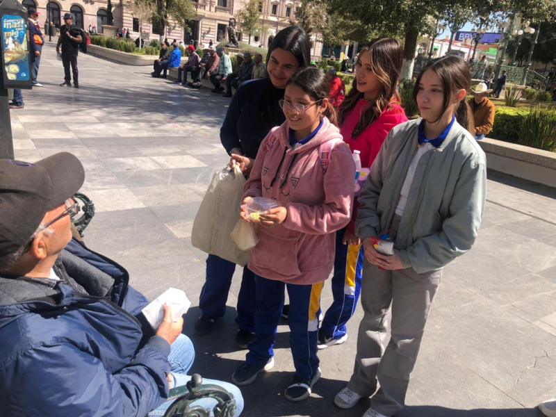 Un grupo de jóvenes estudiantes de la Preparatoria de Ingeniería se encuentra vendiendo waffles en la Plaza de Armas, en el centro de la ciudad, como parte de un proyecto escolar y con el objetivo de reunir fondos para su graduación.