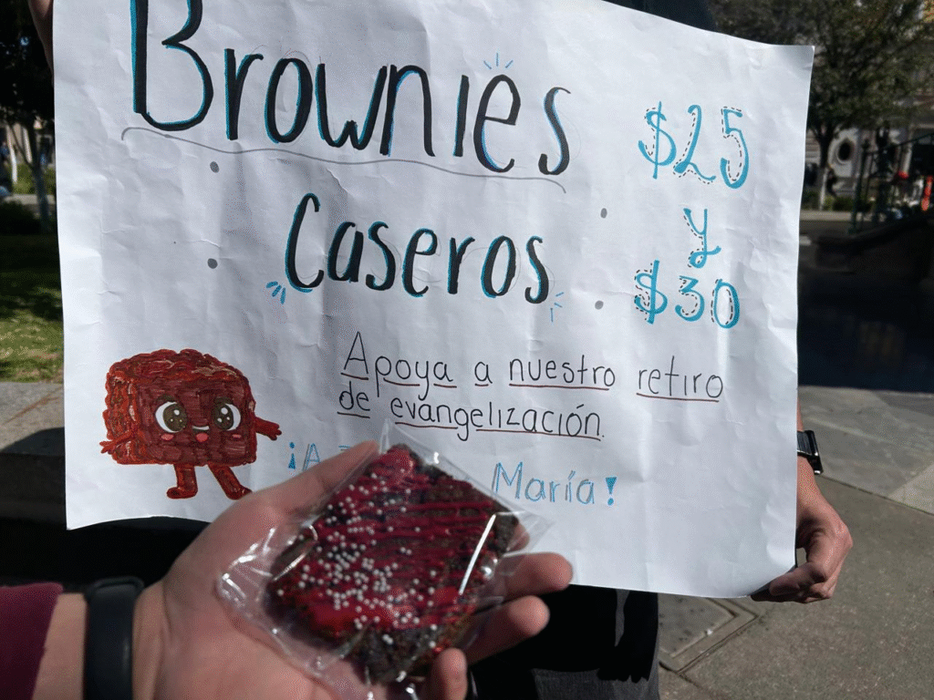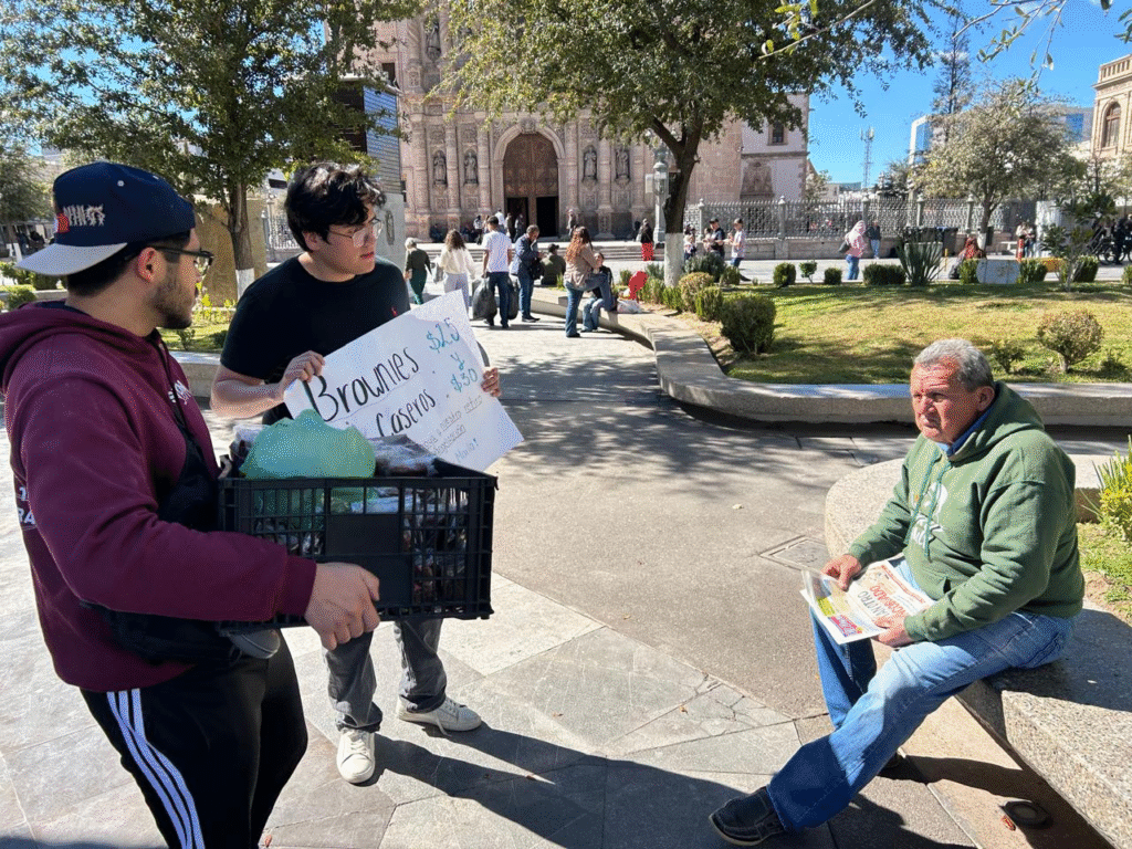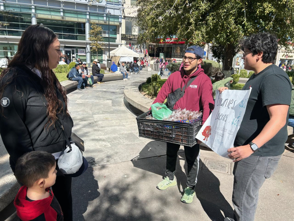 Los jóvenes, identificados como Dante Isaac Maciel Luna y Luis Villa, ofrecían los postres a un precio aproximado de 25 pesos y 30 pesos, destacando que se trata de una actividad organizada para apoyar a un grupo juvenil católico vinculado a la parroquia de San Antonio de Padua.