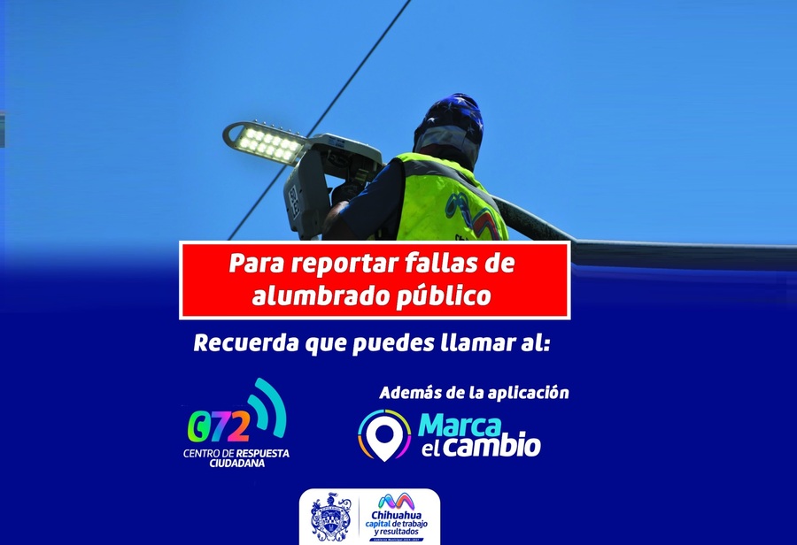Chihuahua, Chih. A 13 de diciembre de 2024.- El Gobierno Municipal, a través de la Dirección de Mantenimiento Urbano, invita a la ciudadanía a realizar reportes por fallas y desperfectos en el sistema de alumbrado público mediante el Centro de Respuesta Ciudadano (CRC) en el número 072 o bien en la aplicación “Marca el Cambio”.