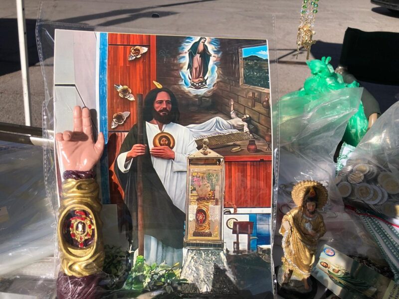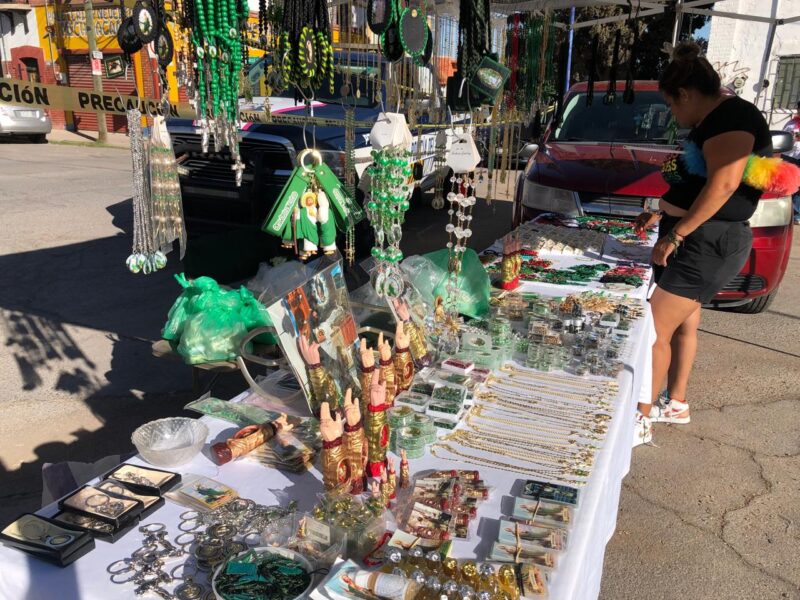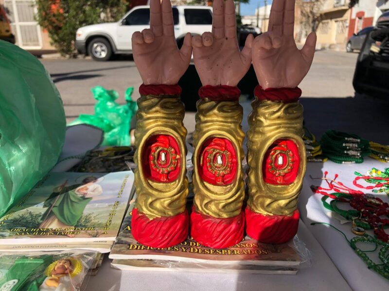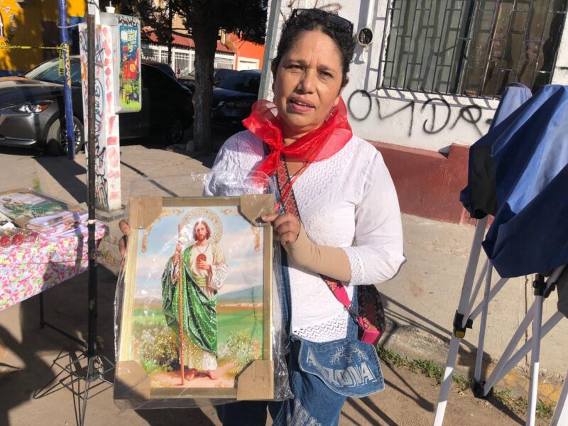 Frente al templo, en las calles aledañas como Santos Degollados y Gómez Morín, el comercio relacionado con el santo de las causas difíciles floreció. Vendedoras ofrecían una variedad de artículos religiosos. “Tenemos la réplica de la reliquia en 100 pesos, y hoy lleva una foto de regalo”, explicó una de ellas. Erika García, otra vendedora, detalló su mercancía: “Vendemos pulseritas, rosarios, llaveros de San Judas, crucesitas… todo para honrar esta visita”. Los puestos, llenos de imágenes y símbolos del santo, se convirtieron en parada casi obligatoria para quienes buscaban un recuerdo tangible de la jornada.