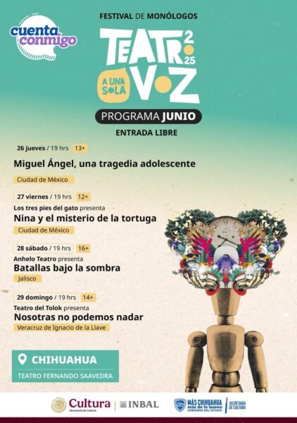 La Secretaría de Cultura invitó a la ciudadanía a disfrutar del circuito del Festival de Monólogos “Teatro a una sola voz” 2025 en la ciudad de Chihuahua, el cual celebra su vigésimo aniversario con cuatro puestas en escena provenientes de Ciudad de México, Jalisco y Veracruz.