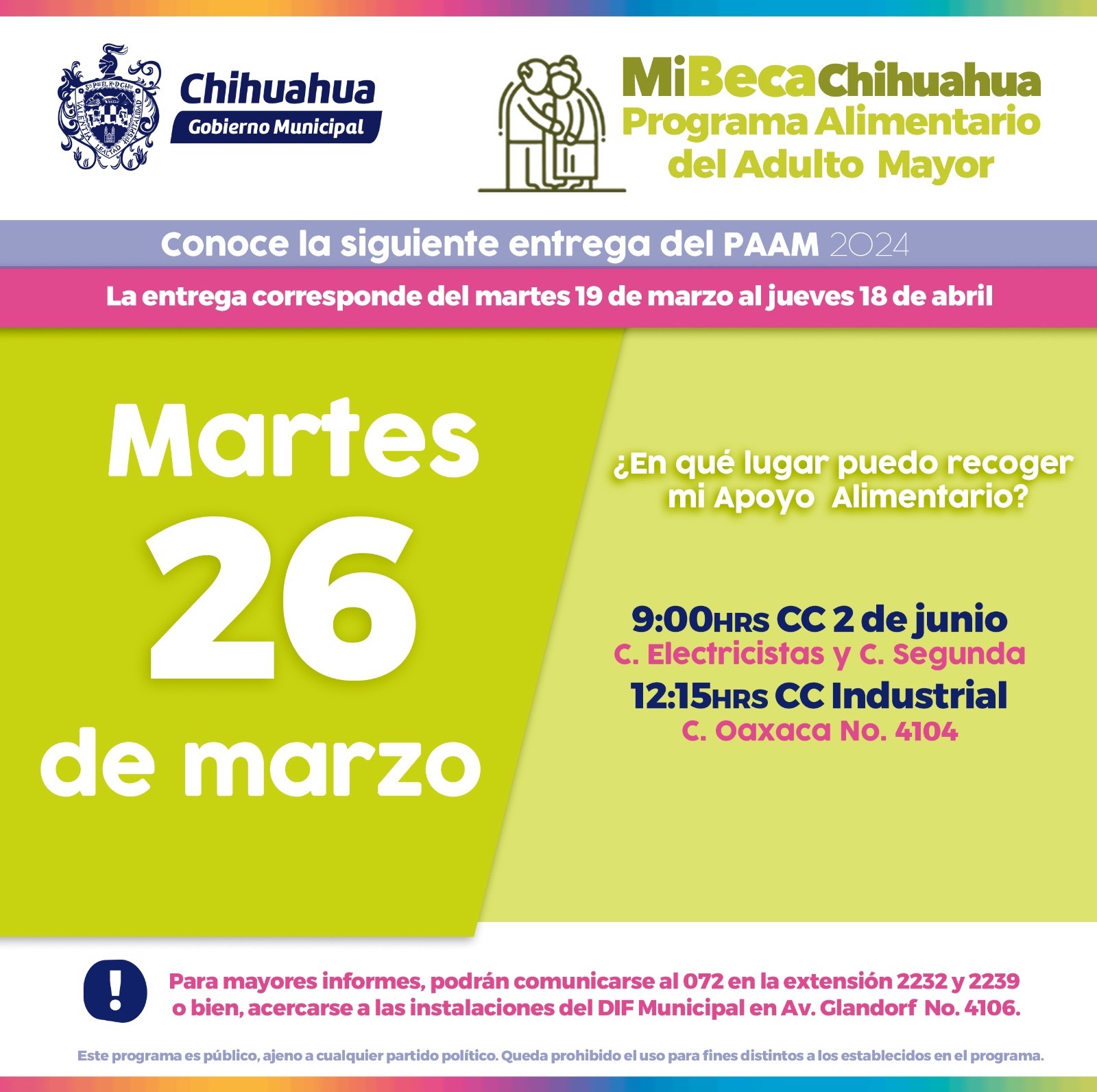 Chihuahua, Chih. A 25 de marzo de 2024.- El Gobierno Municipal, a través del DIF, informa a quienes forman parte del Programa Alimentario del Adulto Mayor (PAAM) que podrán acudir por su paquete alimentario este martes 26 de marzo en los centros comunitarios 2 de Junio, a las 9:00 horas e Industrial a las 12:15 horas.