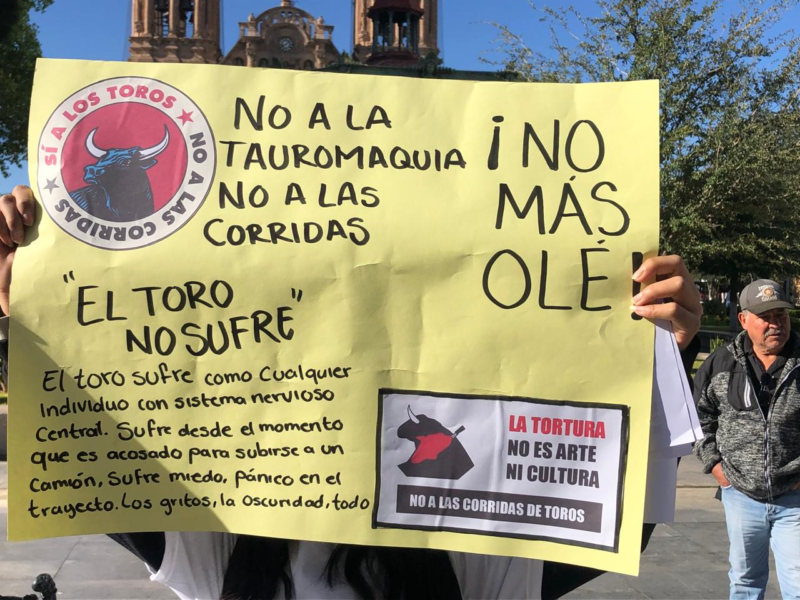 Luego de bloquear la Calle 11 junto al Palacio de Gobierno así como el acceso a el mismo, manifestantes en contra de las corridas de toros se movilizaron hacia la Plaza de Armas, frente a la Presidencia Municipal, para continuar con su protesta. La manifestación, en rechazo a la corrida programada para el 23 de noviembre en la Plaza de Toros, ha desquiciado el tráfico en el Centro de la ciudad, afectando la circulación en varias calles aledañas.