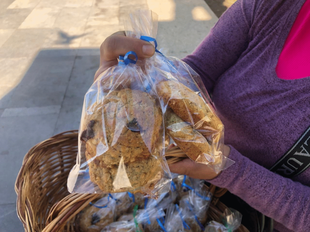 Marina elabora tres variedades principales: avena con arándano, avena con plátano y avena con manzana, todas hechas desde su casa con recetas propias que incluyen ingredientes como leche, huevo, canela y vainilla. “Cada bolsa cuesta 25 pesos, pero también tengo promoción de 2×40”, explicó. Además, prepara empanadas de camote y calabaza, que también son muy solicitadas.