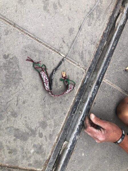 Armado con una extensión de palo y un gancho de su propia creación, Martín desliza su artefacto por la grieta para alcanzar objetos como aretes o fundas de teléfonos. Para las monedas, recurre a un imán adherido a otra herramienta. “Hoy fue un día de suerte: rescaté un anillo de plata y una pulsera”, comentó mientras mostraba su hallazgo matutino.