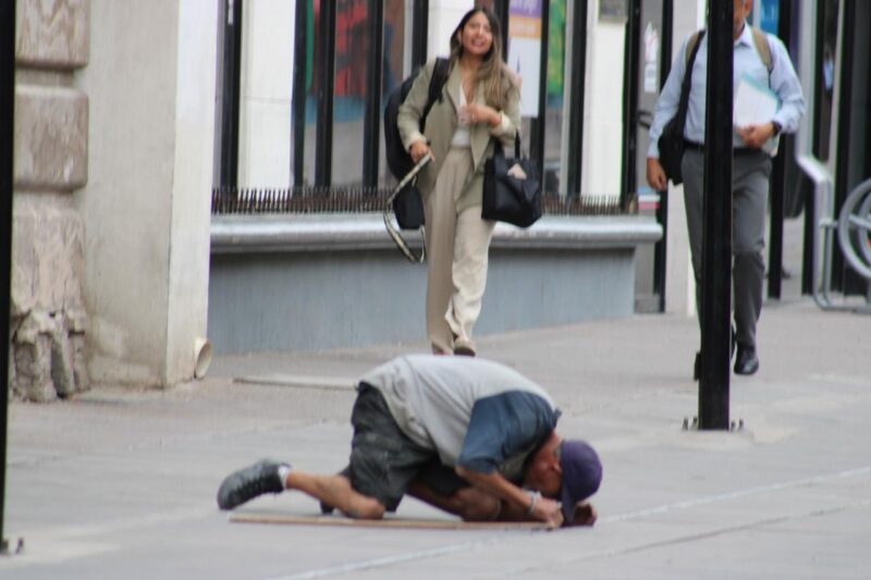 En el bullicioso corazón del Centro Histórico de Chihuahua, entre el ir y venir de transeúntes por el emblemático Paseo Victoria, un personaje singular ha capturado la atencion: Martín, un hombre que dedica sus mañanas a “pescar” objetos perdidos en la línea metálica para personas con discapacidad visual.