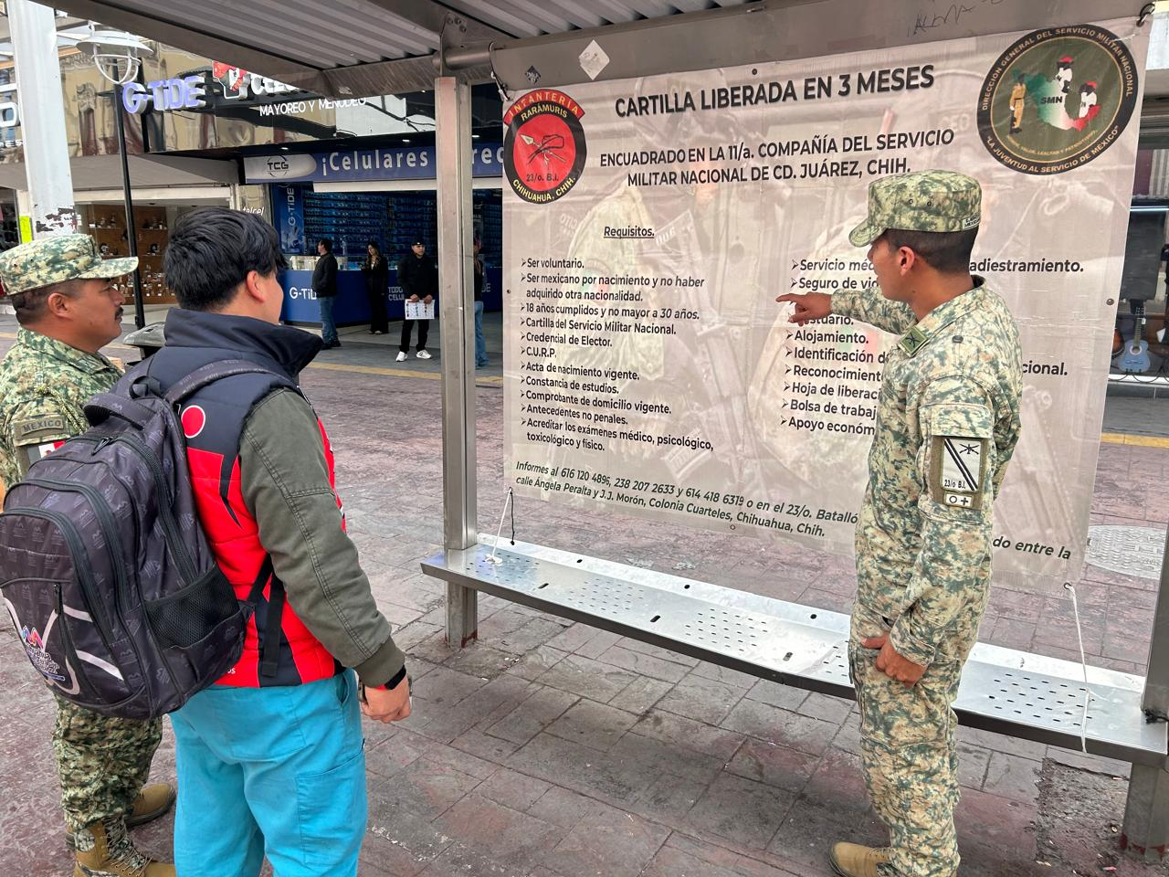 De acuerdo con la información difundida en una lona instalada en el lugar, los interesados pueden liberar su cartilla militar en un periodo de tres meses, al encuadrarse en la Onceava Compañía del Servicio Militar Nacional, con sede en Ciudad Juárez, Chihuahua.