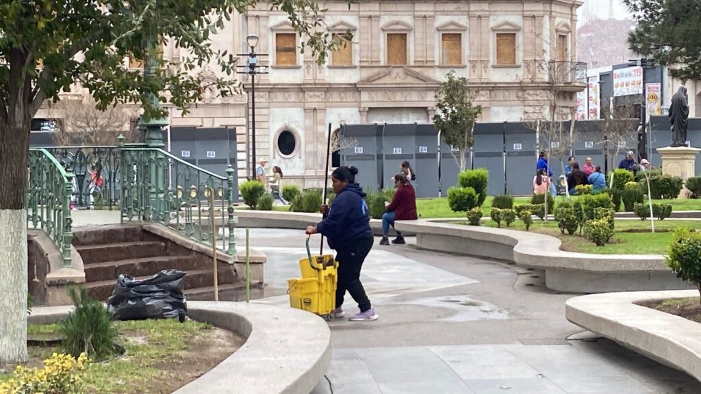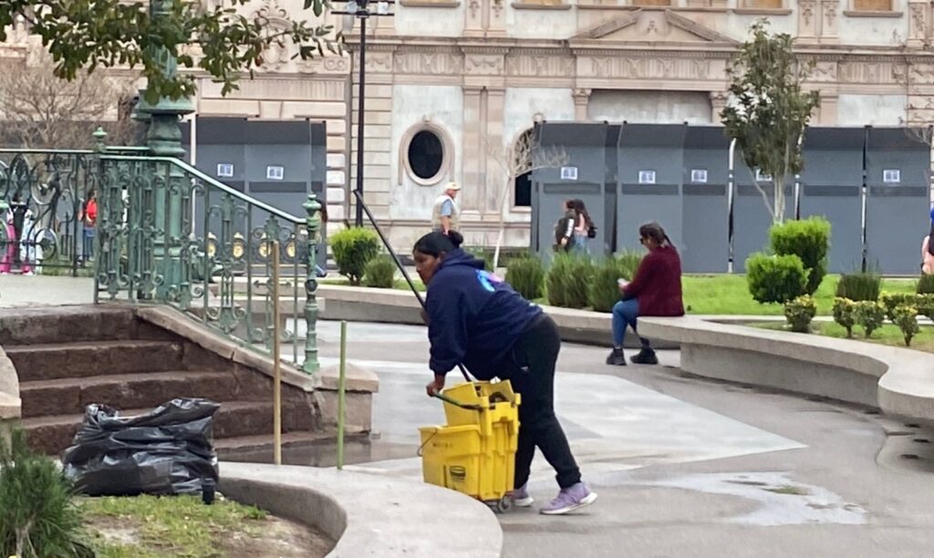 Un día después de la marcha del 8M, la Plaza de Armas de Chihuahua capital fue testigo de un escenario que refleja una paradoja: mujeres trabajadoras del municipio, equipadas con chalecos, escobas, recogedores y trapeadores, limpiaban los restos de carteles, pintas y escombros dejados por la movilización del Día Internacional de la Mujer. Mientras un grupo de mujeres ejercía su derecho a la protesta, otro grupo de mujeres —empleadas municipales— asumía la tarea de restaurar el orden y la imagen del centro histórico.