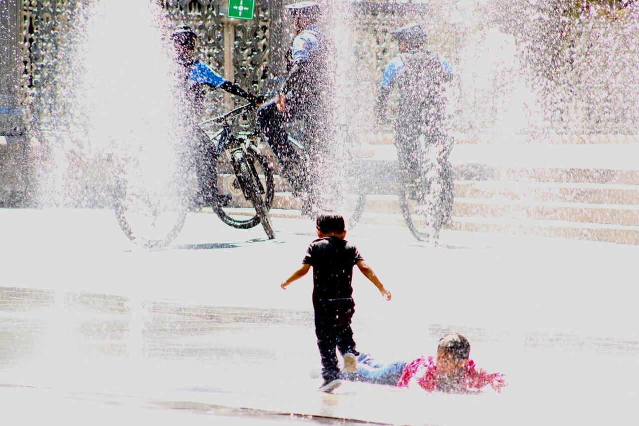 Niños refrescan el calor en las fuentes de la Plaza de Armas bajo 31 grados de temperatura