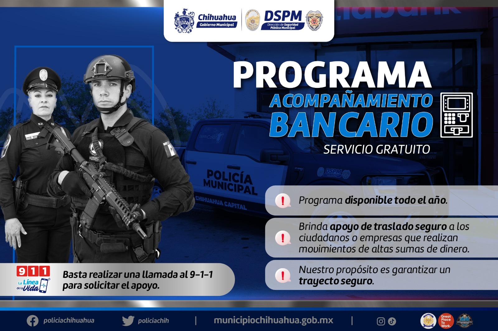 Chihuahua, Chih. A 15 de marzo de 2024.- El Gobierno Municipal ofrece el servicio de “acompañamiento bancario”, un programa que ofrece la Policía Preventiva durante todo el año para escoltar a personas que requieren trasladar fuertes sumas de dinero en efectivo desde una institución a cualquier punto de la ciudad.