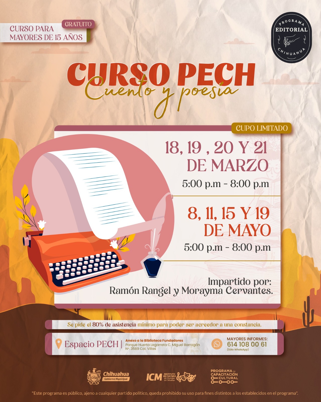 Chihuahua, Chih. A 12 de marzo de 2024.- El Gobierno Municipal, a través del Instituto de Cultura del Municipio, invita a participar en el “Curso de Cuento y Poesía”, dirigido a mayores de 15 años que deseen explorar y desarrollar su creatividad literaria.
