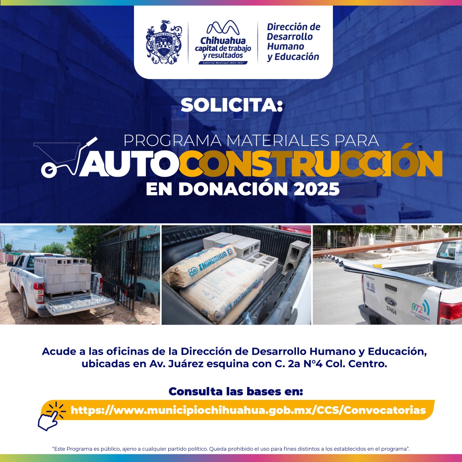 _*Chihuahua, Chih., a 9 de enero de 2025.-*_ El Gobierno Municipal, a través de la Dirección de Desarrollo Humano y Educación, invita a personas en situación de vulnerabilidad a acercarse al Programa de Materiales para Autoconstrucción, para ampliar, construir o rehabilitar sus casas o condiciones habitacionales con la entrega de apoyos en especie de manera gratuita.