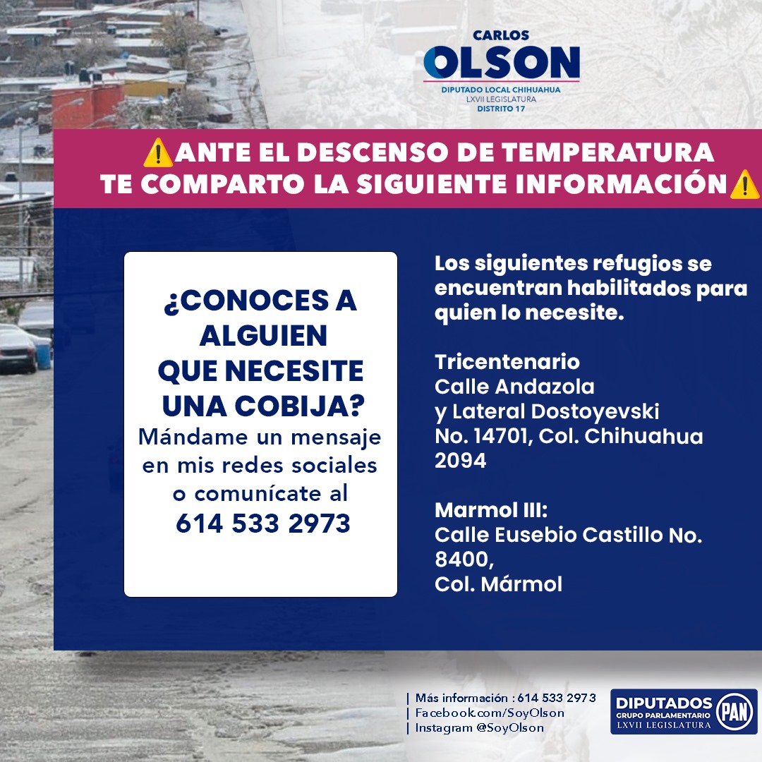 Chihuahua, Chih.- En medio de las frías temperaturas que azotan a la ciudad de Chihuahua, el diputado Carlos Olson hace un llamado a la ciudadanía a unirse en solidaridad y brindar apoyo a quienes enfrentan las inclemencias del clima.