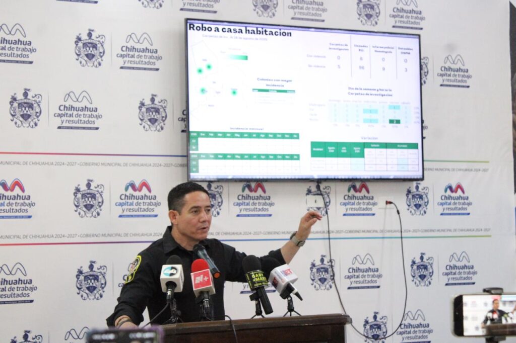 Pero los homicidios no fueron el único delito en retroceso. El robo de vehículos, un flagelo que ha azotado a los chihuahuenses durante años, también registró una caída del 27 por ciento, con 201 casos reportados en 2025 frente a los 389 del año anterior. La violencia asociada a estos robos, según las estadísticas, disminuyó en un 48 por ciento, algo que Salas atribuyó al “sitio policial” implementado en el Distrito Colón, donde se aumentó la presencia de unidades y personal. “No íbamos a salir de ahí hasta ver resultados”, comentó, señalando el mapa que mostraba una tendencia favorable en la zona. Incluso el robo a casa habitación, otro de los delitos que más afectan a la ciudadanía, vio una reducción del 50 por ciento en eventos con violencia, pasando de 60 casos en 2024 a solo 30 en este año.