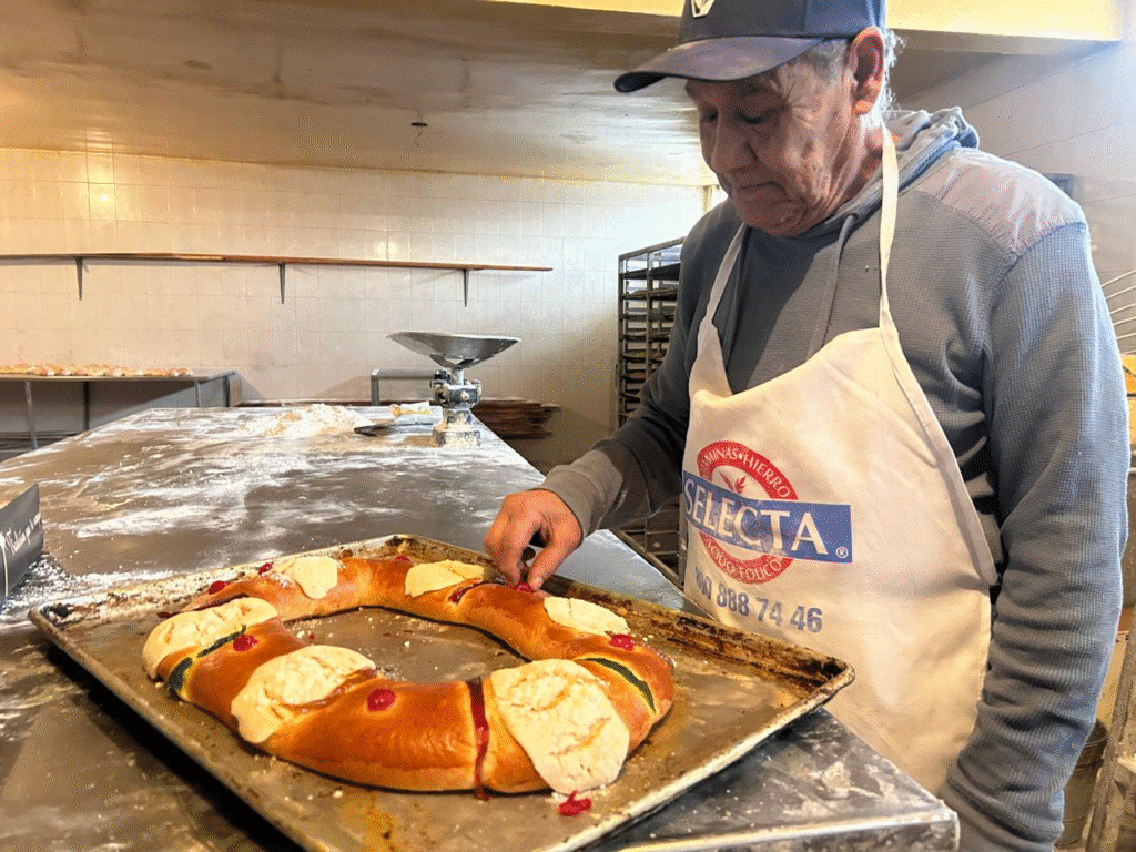 El panadero explicó que la rosca lleva ingredientes tradicionales como harina, mantequilla, huevo, vainilla, además de fruta cristalizada, cereza, acitrón, azúcar glass y la mano de obra propia del proceso artesanal. Cada rosca contiene cuatro muñequitos, como marca la tradición.