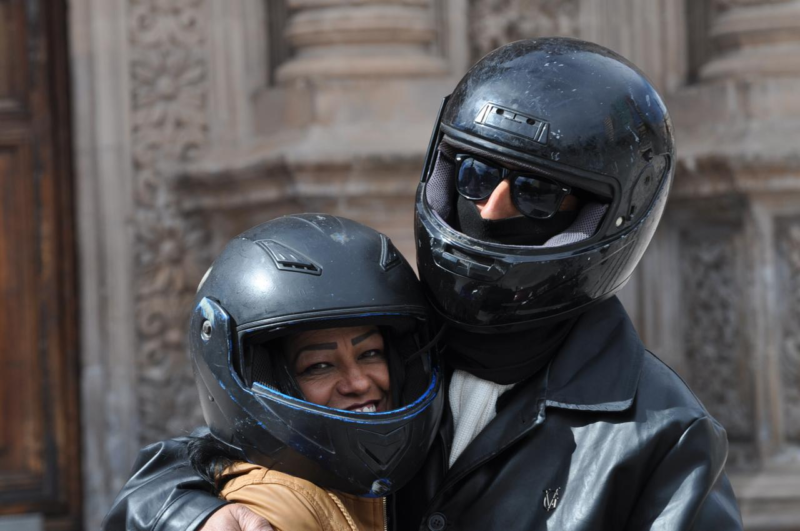 Con sus cascos de motociclistas aún puestos, la pareja se abrazaba mientras se daban muestras de cariño, sumergidos en el espíritu de este día especial. Entre el bullicio de la ciudad y el imponente telón de fondo de la catedral, su amor brillaba con intensidad, cautivando a los transeúntes que pasaban por el lugar.