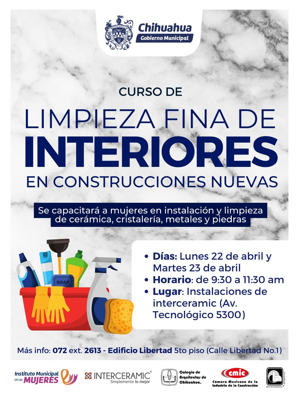 Chihuahua, Chih. A 18 de abril de 2024.- El Gobierno Municipal de Chihuahua, a través del Instituto Municipal de las Mujeres, invita a la capacitación que se tendrá en la especialidad de limpieza fina en construcciones nuevas, con el objetivo de que las mujeres que concluyan el curso puedan ser contratadas o inicien un negocio, dado que en el ramo de la construcción hay necesidad de personas que den este servicio ya sea de cooperativa, pequeña empresa o por cuenta propia.