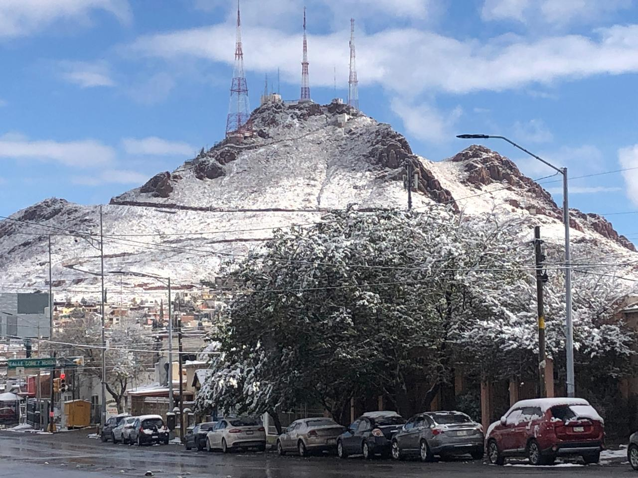 El mediodía de este viernes, la ciudad de Chihuahua ofrece un espectáculo digno de admirar: el Cerro Coronel cubierto de blanco, calles pintadas por la nieve, y parques llenos de familias disfrutando del fenómeno invernal.
