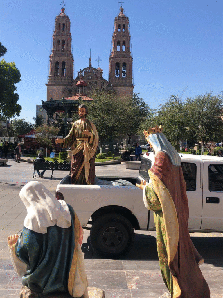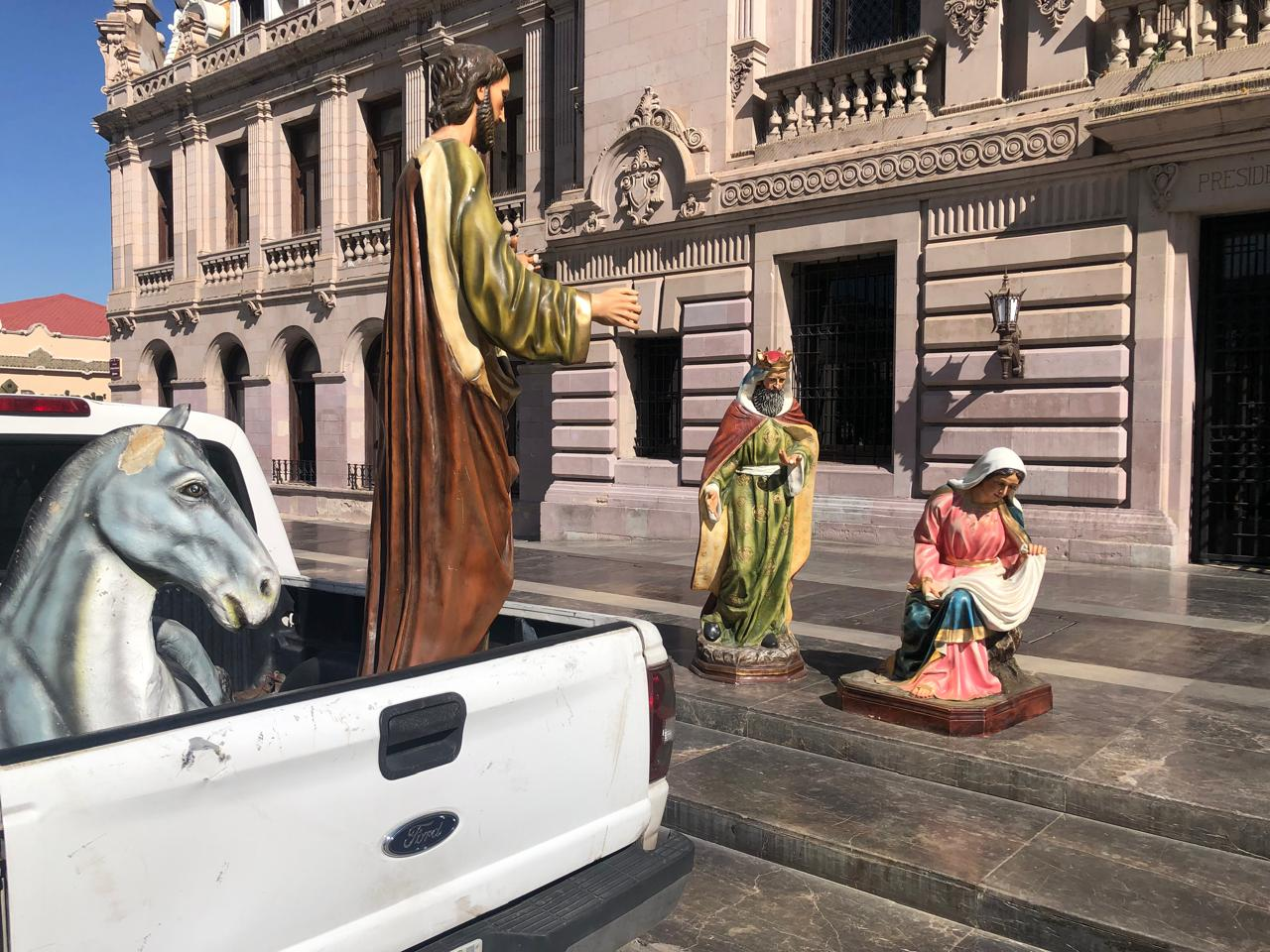 Trabajadores municipales trasladaron hoy las figuras del nacimiento navideño que, como cada año, adornará la Plaza de Armas durante la temporada decembrina. Las piezas, elaboradas en yeso y de tamaño considerable, fueron cargadas en una unidad oficial para recibir mantenimiento y reparaciones, ya que presentan desgaste por su uso en temporadas anteriores.