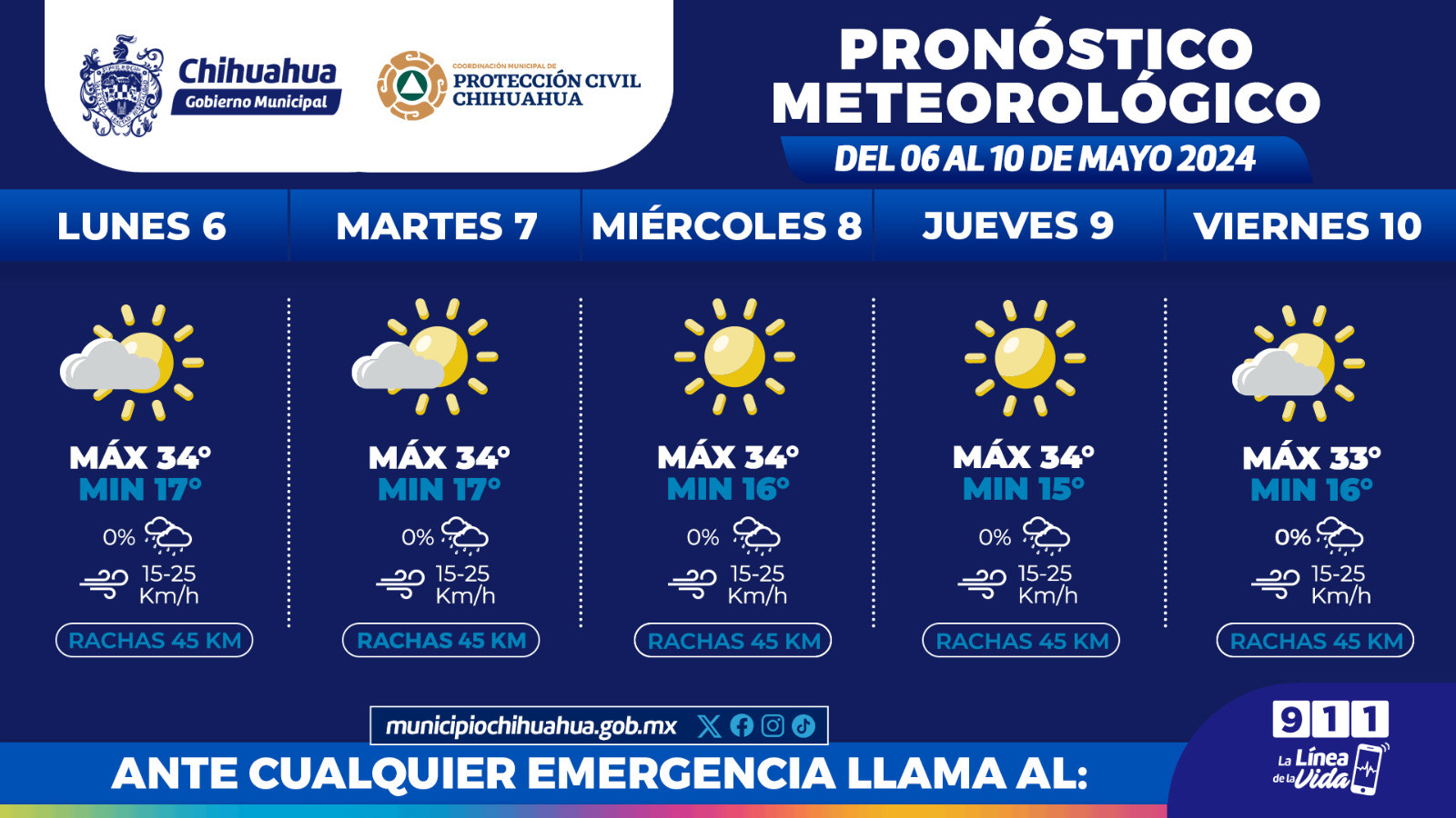 Chihuahua, Chih. A 6 de mayo del 2024.- La Coordinación de Protección Civil Municipal informa que para esta semana se prevén vientos con rachas de hasta 45 kilómetros por hora, además de que seguirán las temperaturas máximas en 34°C.