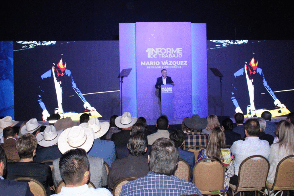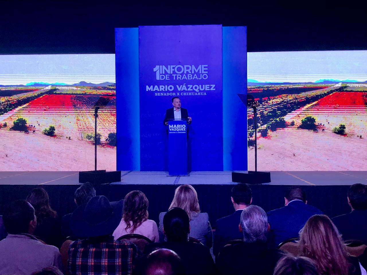 El senador Mario Vázquez presentó hoy su Primer Informe de Trabajo en el Centro de Exposiciones de Chihuahua, donde destacó que durante su primer año como representante del estado en el Senado de la República ha presentado 27 iniciativas (8 de autoría personal y 19 en conjunto con el grupo parlamentario del PAN), además de 7 proposiciones y 42 intervenciones en tribuna, todas enfocadas en defender los intereses de Chihuahua y México.
