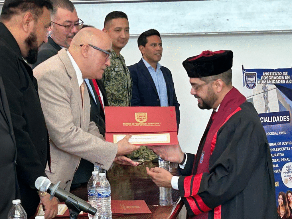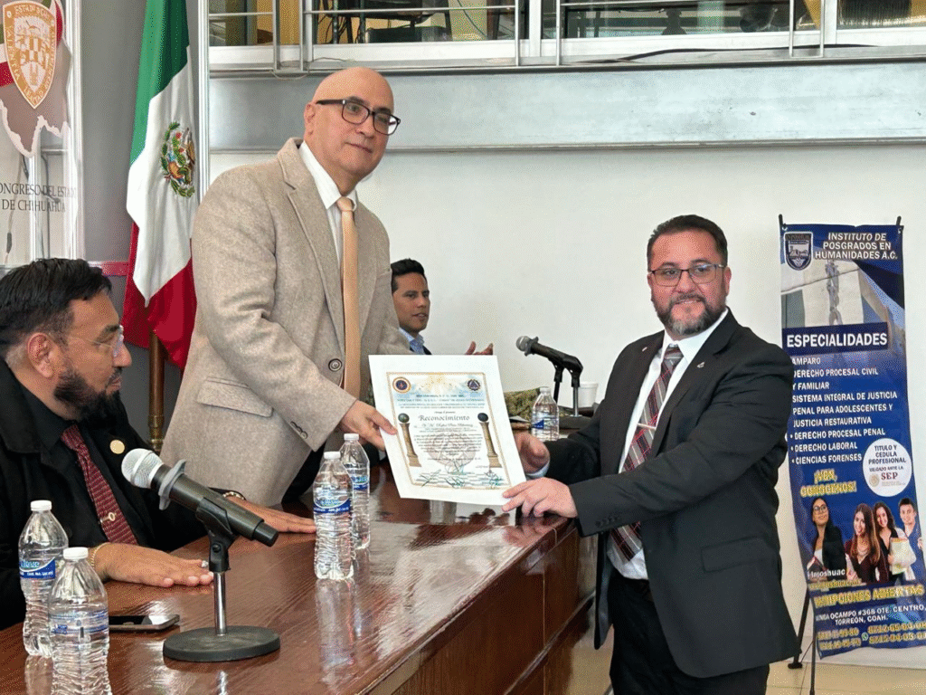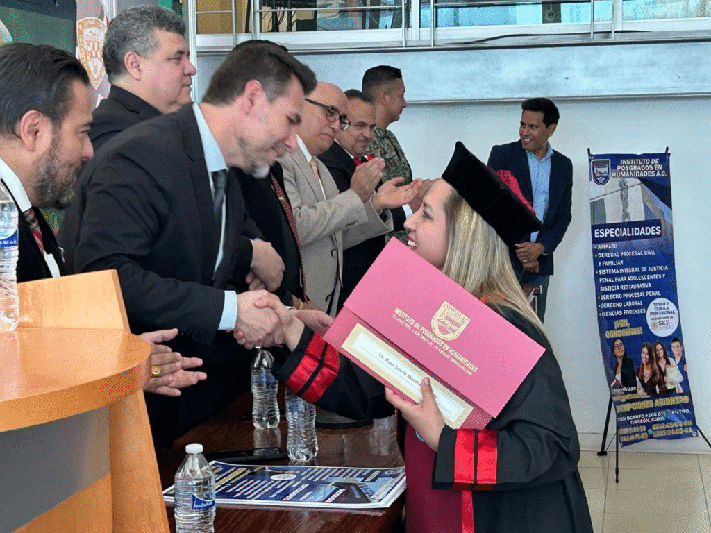 Un momento emotivo fue el reconocimiento al doctor Juan Calvillo, rector del Instituto de Posgrado y Humanidades de la Región Laguna, quien viajó desde Torreón para estar presente en la ceremonia. Los graduandos destacaron su liderazgo y compromiso con la formación de profesionales del derecho en Chihuahua.