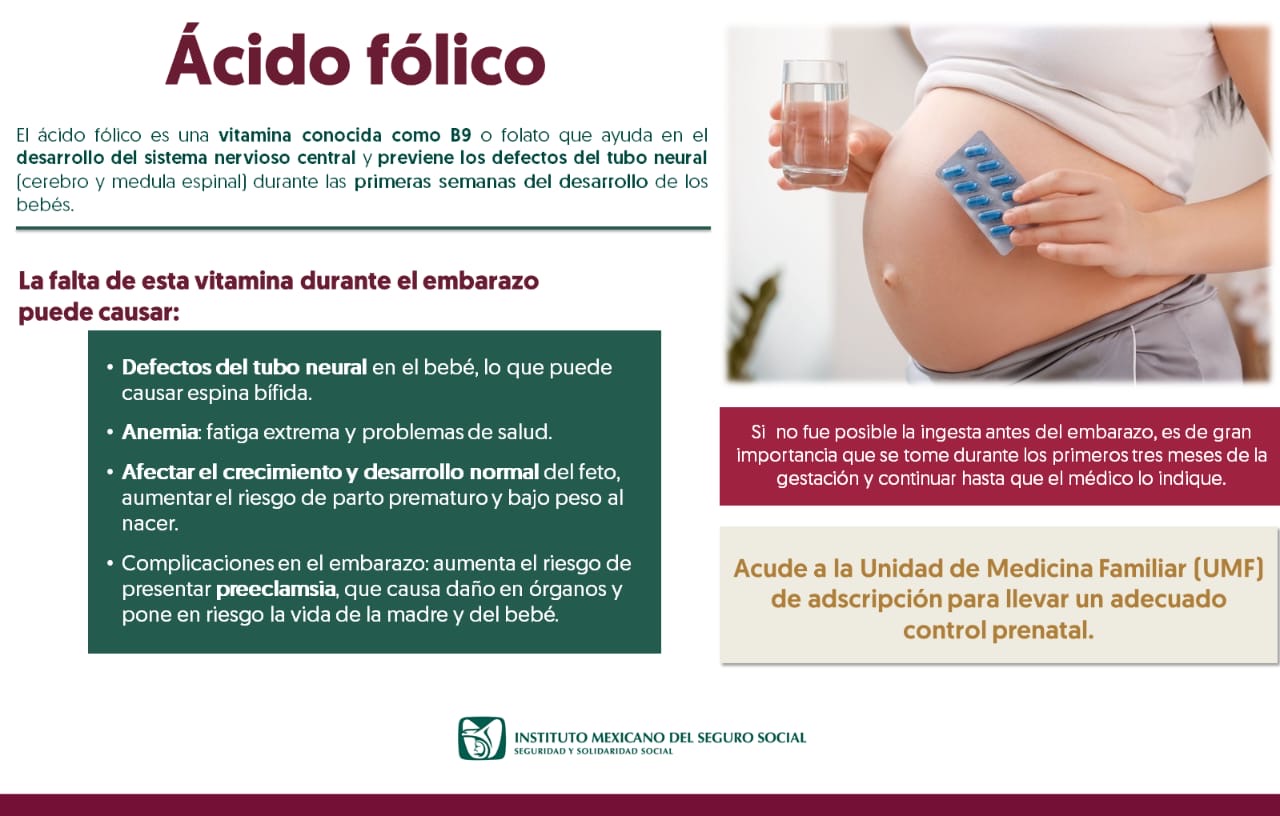 El Instituto Mexicano del Seguro Social (IMSS) en Chihuahua promueve la toma de ácido fólico en las mujeres que desean ser mamás, entre los tres y seis meses antes del embarazo, así como en el primer trimestre de gestación, pudiendo prolongarse hasta su término.