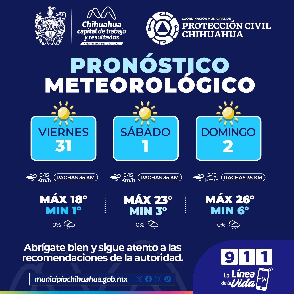 *** Chihuahua, Chih. A 31 de enero del 2025_*.- La Coordinación Municipal de Protección Civil, informa que este fin de semana, del 31 de enero al 2 de febrero, se prevén temperaturas cálidas por la tarde, con máximas de 26°C y mínimas de 1°C.