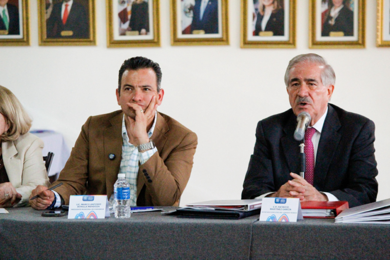 La Sesión estuvo encabezada por el alcalde, Marco Bonilla Mendoza, Patricio Martínez, ex gobernador y presidente del fideicomiso, Aida Amanda Córdova Chávez, Tesorera Municipal y Olivia Franco Barragán, titular de la Sindicatura Municipal.