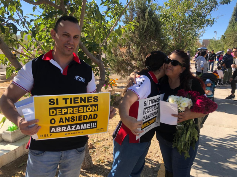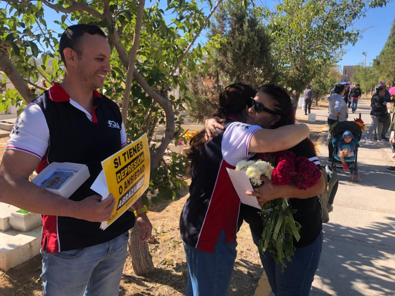 Durante su visita al panteón, los voluntarios no solo distribuyeron información, sino que también promovieron el contacto humano a través de abrazos, recordando que en ocasiones, un gesto simple puede marcar la diferencia en la vida de alguien que atraviesa momentos difíciles.