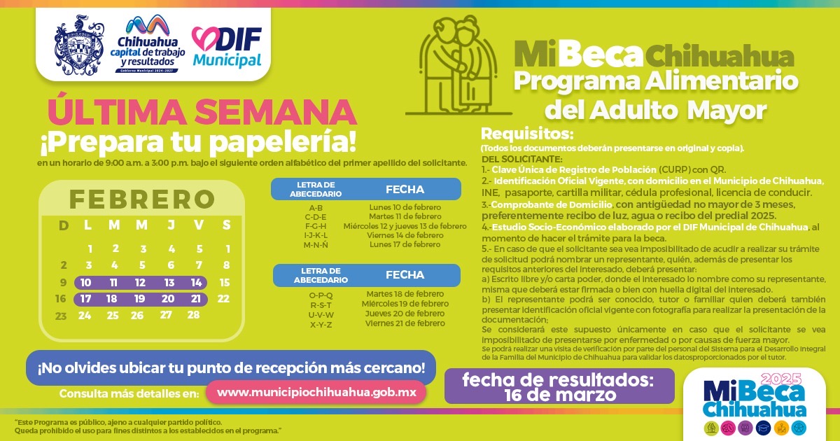 _*Chihuahua, Chih., a 16 de febrero de 2025.-*_ El Gobierno Municipal, a través del DIF, informa que este viernes 21 de febrero cierra el proceso de recepción de documentos para el Programa Alimentario del Adulto Mayor (PAAM) edición 2025, por lo que invitan a continuar con el registro para no perderse la oportunidad de ser parte de este apoyo que brinda el Municipio.