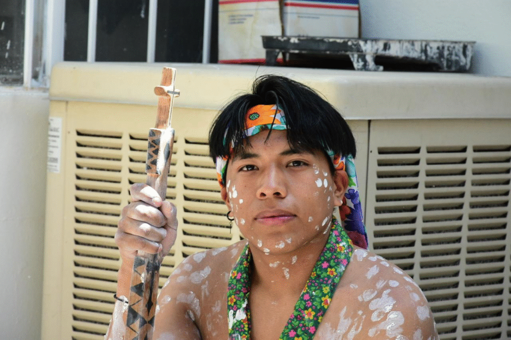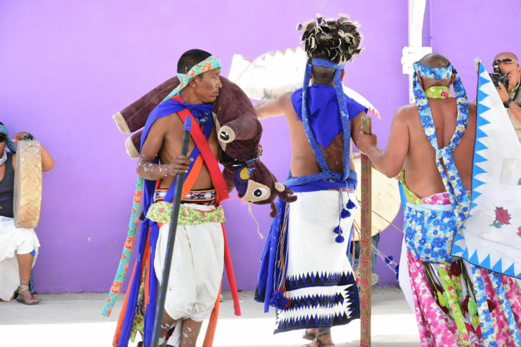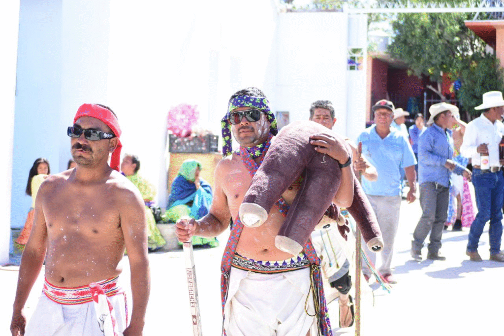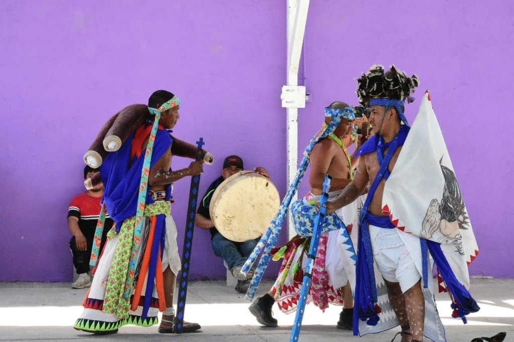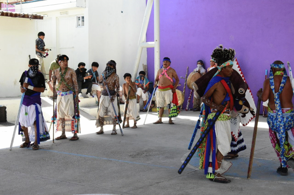 Desde temprana hora, los participantes comenzaron con los preparativos del ritual, destacando la presencia de los llamados “pintos”, hombres rarámuri que cubren su cuerpo con arcilla blanca, representando figuras espirituales dentro de la cosmovisión indígena. A lo largo del día, realizaron danzas tradicionales al ritmo de tambores y violines, en un ambiente donde la música y el movimiento marcaron el desarrollo de la ceremonia.