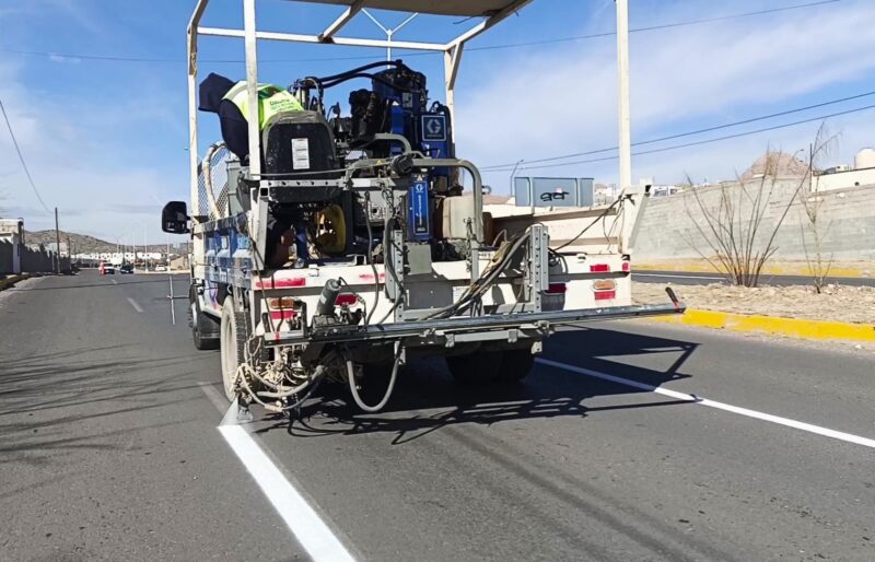 Este miércoles 24 de abril se realizan intervenciones con guiones en el Periférico Francisco R. Almada, de la avenida Francisco Villa al boulevard Fuentes Mares, y en pasos peatonales en la colonia Punta Oriente.